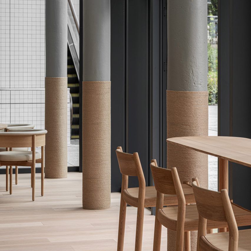Oak chairs sit amongst paper yarn-wrapped columns within this Blue Bottle Coffee cafe in Yokohama, Japan created by Keiji Ashizawa Design and Norm Architects.