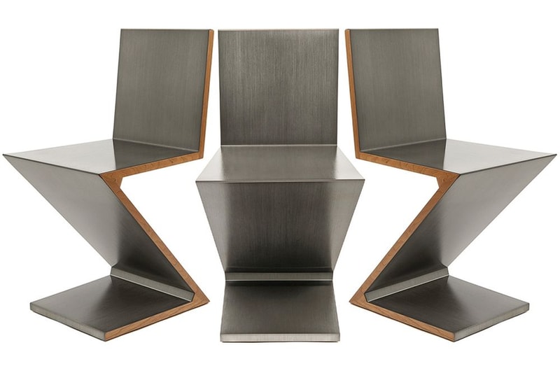 「Zig Zag」椅子最初為荷蘭設計師 Gerrit Rietveld 在 1930 年代時亮相的作品,奇特的骨架塑造出閃電般的輪廓,看似簡約的造型為達到平衡、乘載重量,實則蘊涵大量原理;這回在維持原始的角度下,結合雙方美學,選擇於木頭材質上覆蓋一層金屬,呈現更加俐落的現代質感。