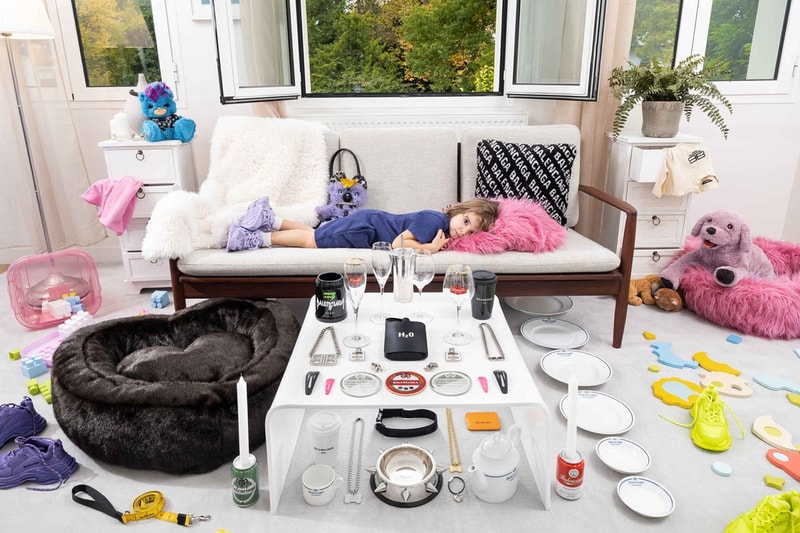 除了為寵物設計背帶、心形絨毛床組、碗盆等,Objects 系列中又以攜手藝術家 Tejo Remy 運用廢棄回收材料堆疊綑綁而成的長椅,以及 Balenciaga Hotel & Resorts 風格床包、腳踏墊、門巾、與瓷器品牌 Ginori 1735 合作的茶壺、茶杯、餐盤尤為吸睛,並由攝影師 Gabriele Galimberti 操刀形象大片,以產品圍繞著孩子的構圖詮釋溫馨卻又別具 Balenciaga 特色的室內氛圍。